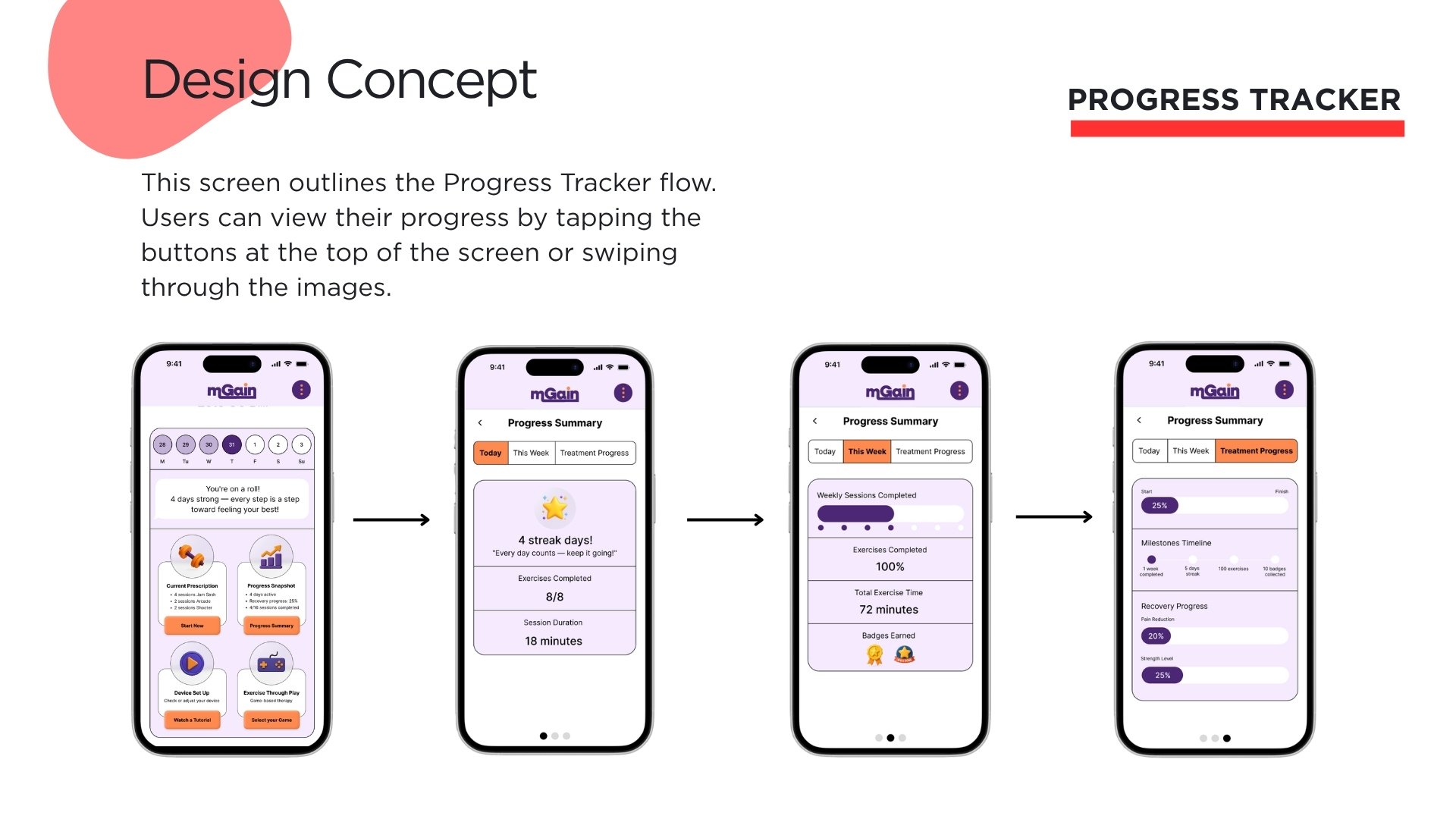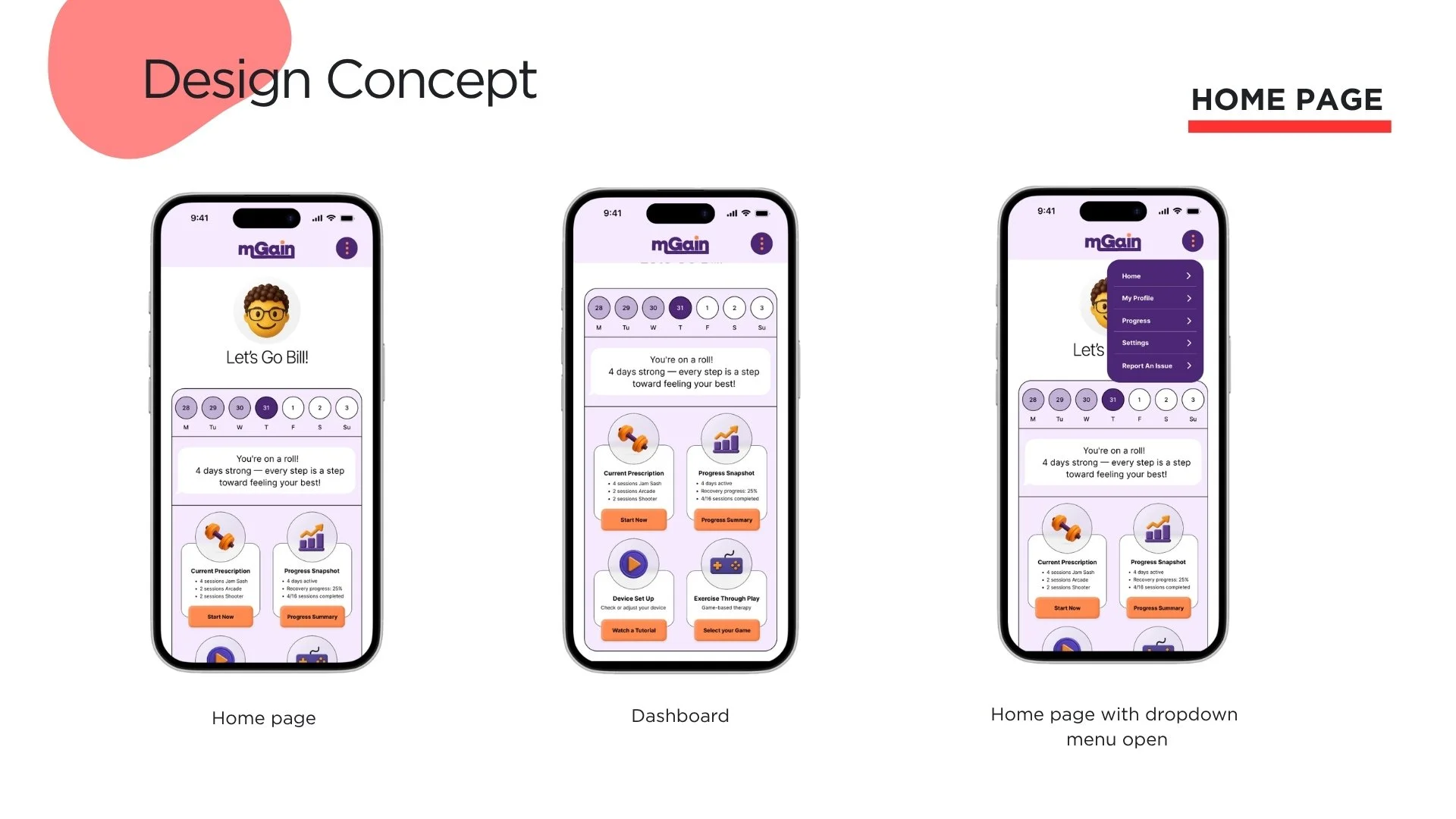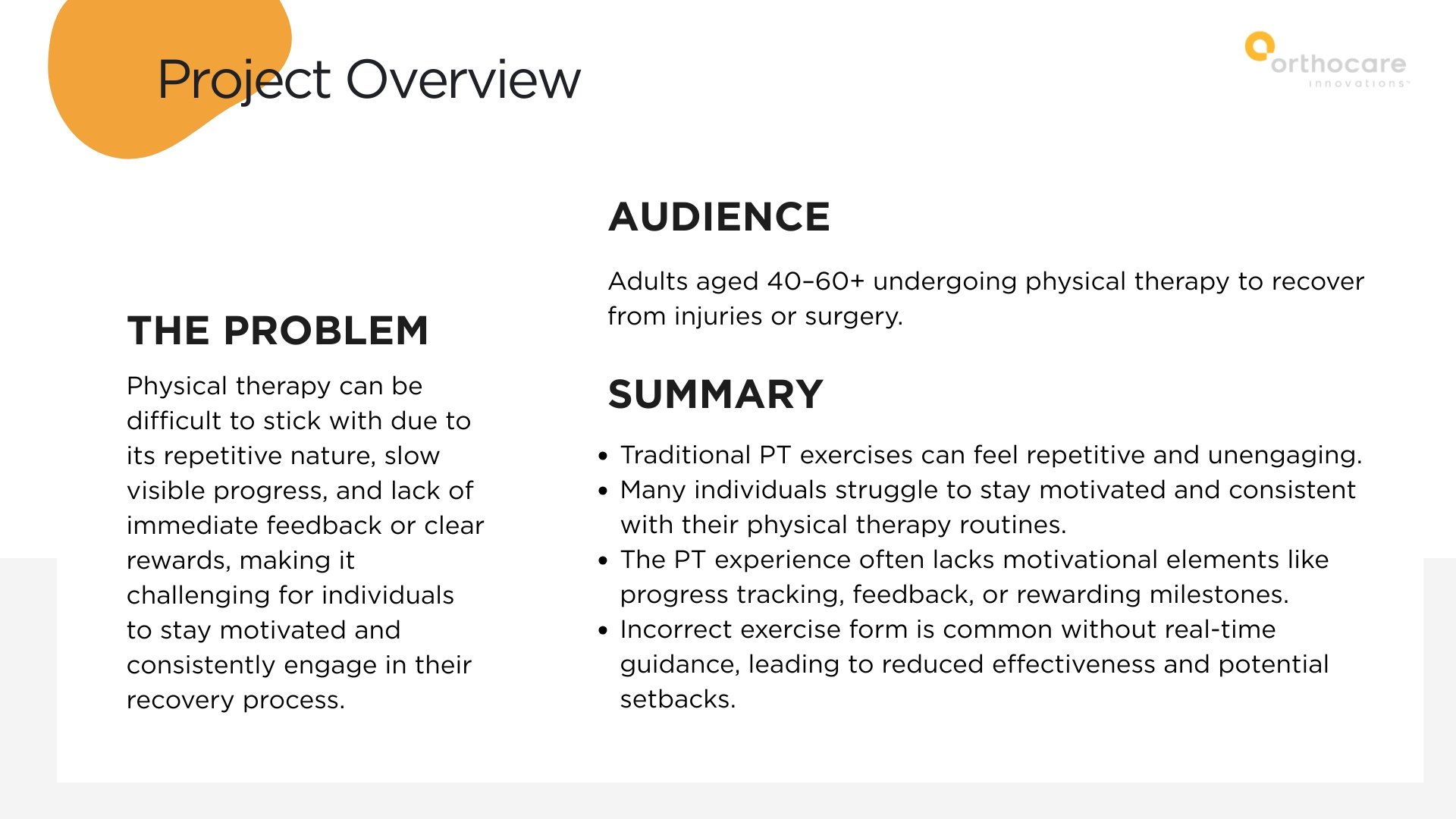In collaboration with a multidisciplinary team, I helped design a mobile app experience that reimagined physical therapy as a more engaging, motivating, and user-friendly process for adults recovering from injury or surgery. The goal was to improve adherence to PT routines by reducing repetition fatigue and introducing progress tracking, gamified exercise flows, and clear instructional support.
